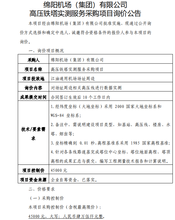 綿陽(yáng)機(jī)場(chǎng)(集團(tuán))有限公司 高壓鐵塔實(shí)測(cè)服務(wù)采購(gòu)項(xiàng)目詢價(jià)公告