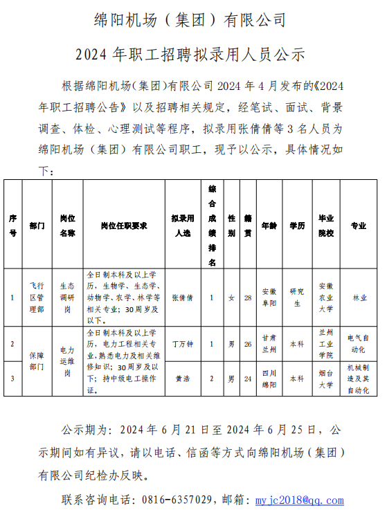 綿陽(yáng)機(jī)場(chǎng)(集團(tuán))有限公司 2024 年職工招聘擬錄用人員公示